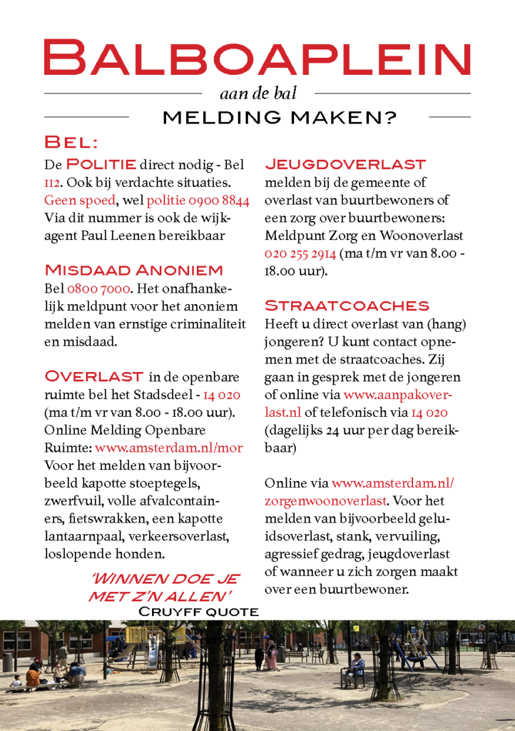 In vervolg op de nieuwsbrief de flyer met informatie telefoonnummers. En vraag om mee te werken aan goede ideeën voor het plein.